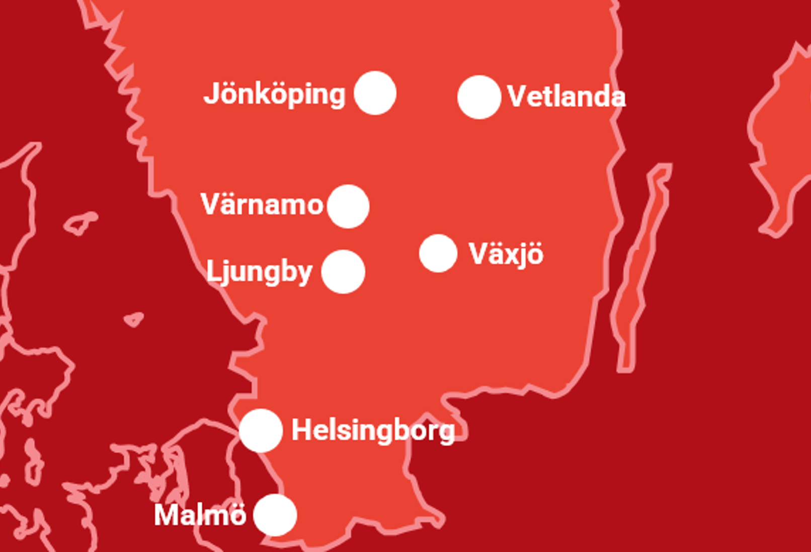 I Region Syd har vi kontor i Växjö, Ljungby, Värnamo, Vetlanda, Jönköping, Helsingborg och Malmö.